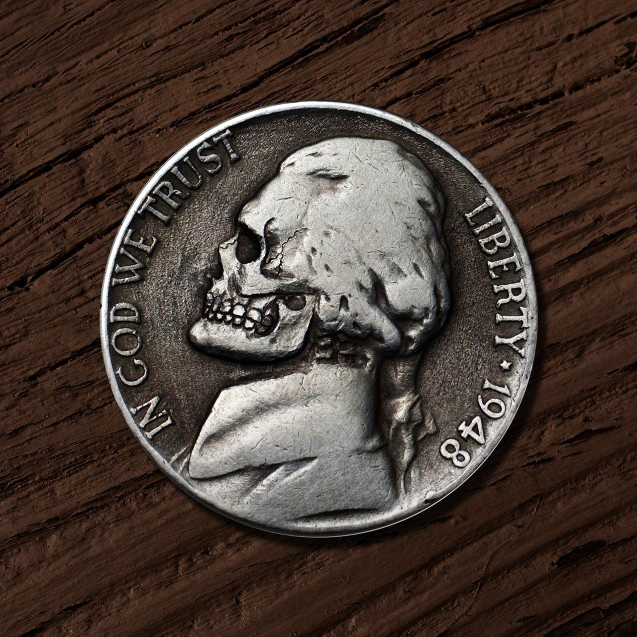 Hobo nickels are actual U.S. coins (usually Buffalo nickels but sometimes Jefferson) whose original image has been carved away and replaced with something more whimsical. These folk-art pieces are known as hobo nickels because hobos supposedly started carving them on long train rides during the Depression. In fact, hobo nickels first appeared in 1913, the year the Buffalo nickel was released, and are still carved by artists today.