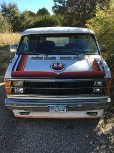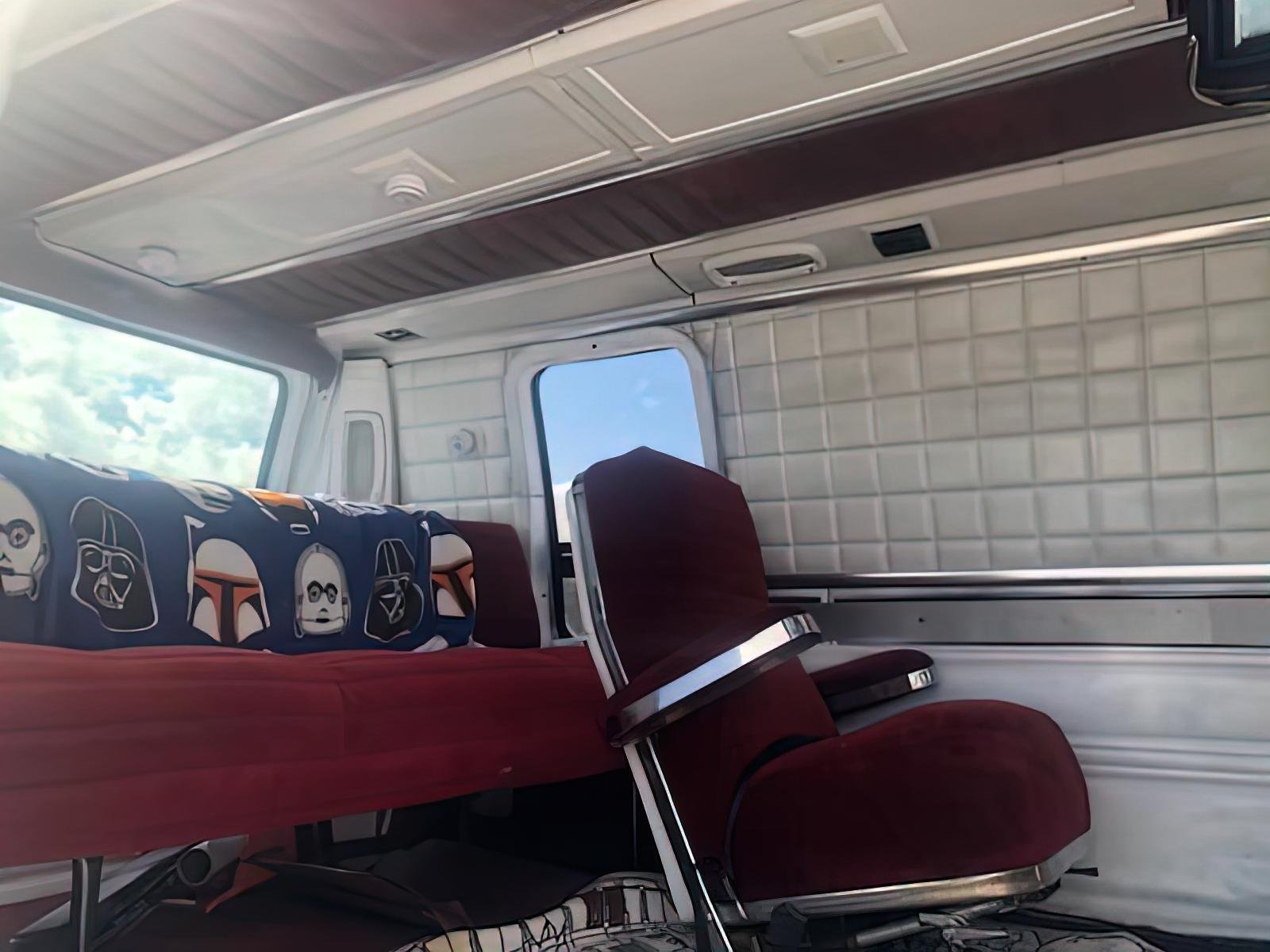 This van’s look is more than just stickers, though. The roof spoiler and custom taillights add a really cool look, and the offset mag wheels make it look like an A-Team/Star Wars crossover. The van’s door handles have been shaved, but as far as getting in the van, the current owner doesn’t know how to open operate the doors so you’ll either have to crawl through the back door or rely on the Force. Once inside, the interior is just as customized as the exterior with unique white and red seats designed to look like a cockpit of the ’70s era spacecraft.