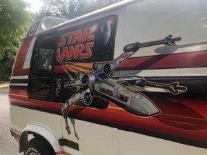 According to the listing, this van was created two years after the original Star Wars movie (aka, Episode IV – A New Hope) debuted in 1977, and all of the paint and decals are original to the van – although we’re not sure if that’s the case with the Chewbacca window sticker. Along each side of the van is the Hans Solo quote: “traveling through hyperspace ain’t like dustin’ crops.”
