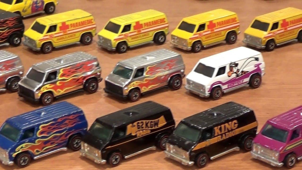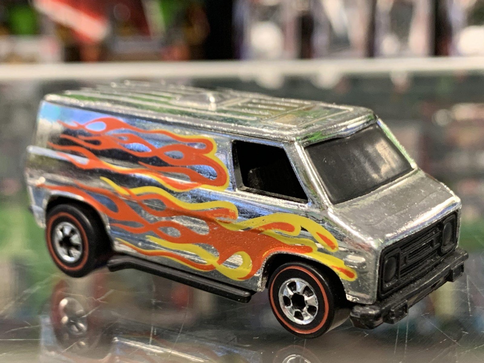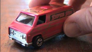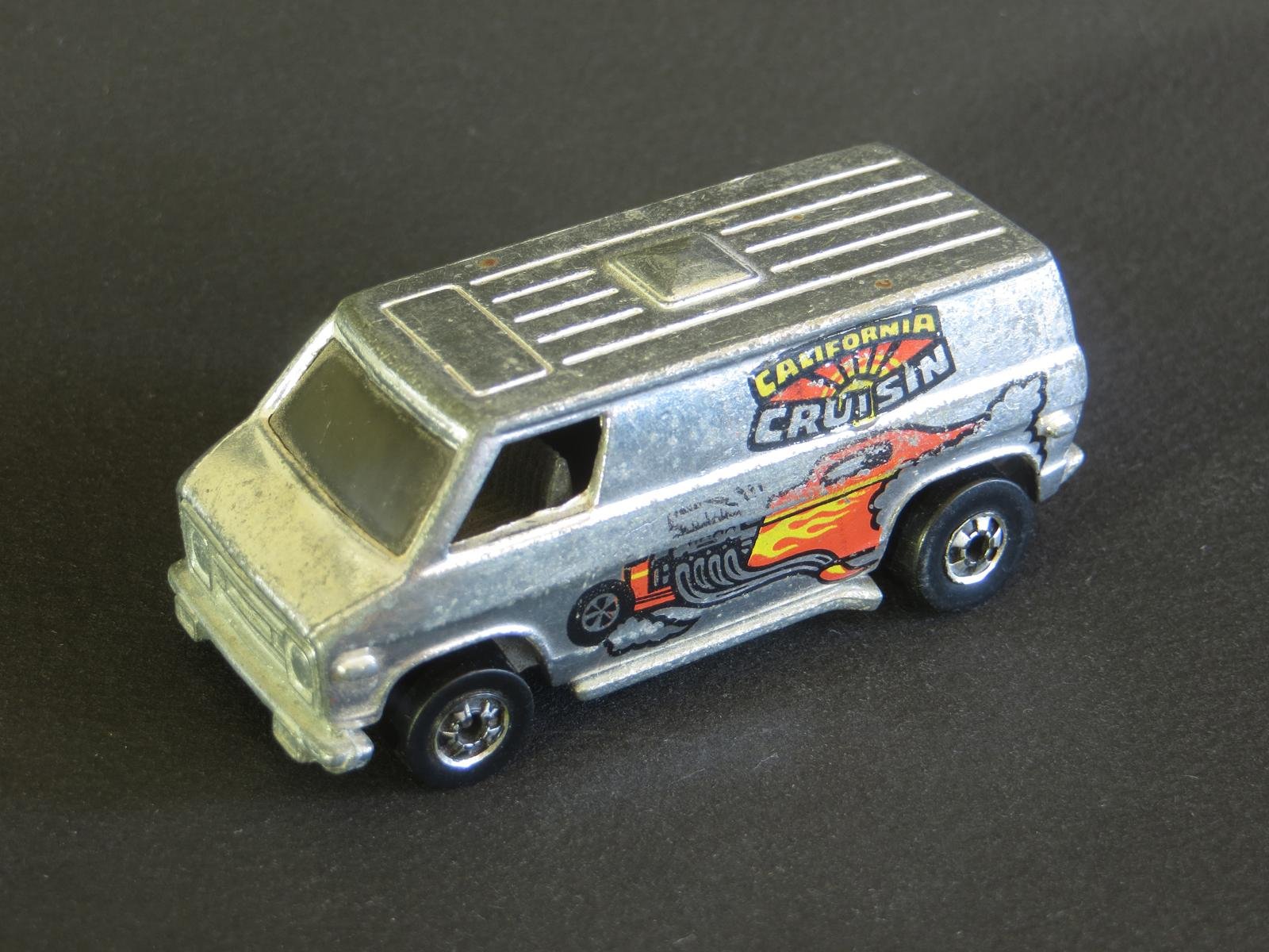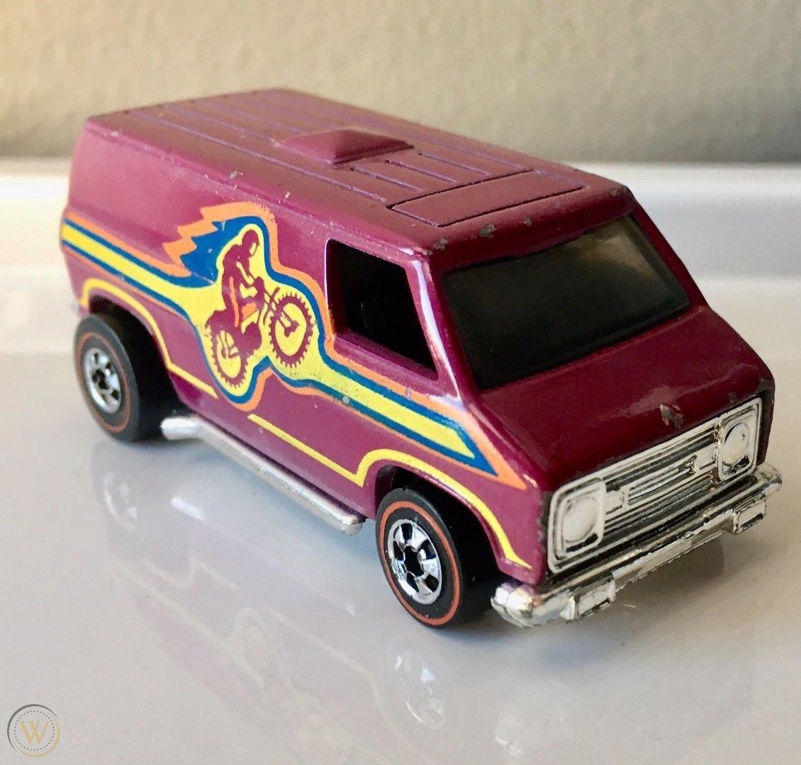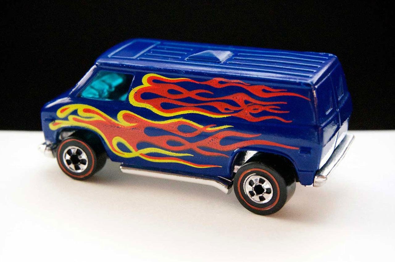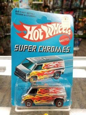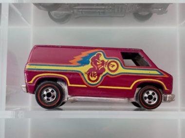 The Super Van, first issued in 1975 as part of the Flying Colors line, was based on the Chevy Van that was popular in the mid-’70s. In that first year of production, the Super Van was issued with three different paint color tampo variations: Black with Red/Yellow Flame Tampo, Blue with Red/Yellow Flame Tampo, and Plum with the “Motocross” Tampo. The black version was the normal release. The blue version was available only in the “Canyon Cutoff” set and the Motocross version was released in BP albeit with a much shorter production run than the black version. Also in 1975, two variations were made for the Herfy’s Promotion and in 1976 a version for Toys-R-Us was released: Black with orange 62 KGW Radio tampo, Black with orange KING Radio tampo, and White Geoffrey Van… learn more about the Super Van models here >