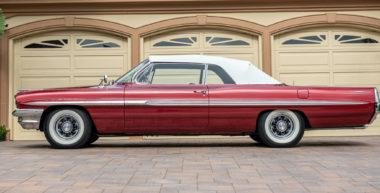 This 1961 Pontiac Bonneville convertible was delivered new in Texas and acquired by the current owner in 2010. Power is supplied by a 425A 389ci V8 equipped with triple Rochester carburetors paired with a four-speed manual transmission, and the car features factory power windows, steering, and brakes. A refurbishment was carried out by the current owner, including a repaint in Coronado Red, a reupholstered red and burgundy leather interior, and a rebuilt engine. The gearbox was overhauled with a Centerforce clutch and throwout bearing, and additional equipment includes an aftermarket audio system, a Hurst shifter, air conditioning, a power-operated convertible top, and more. This Bonneville is offered by the seller on behalf of its current owner in Calabasas, California with refurbishment records and photos, factory literature, a copy of the window sticker and other PHS documentation, and a clean Montana title in the name of the current owner’s company… read more >