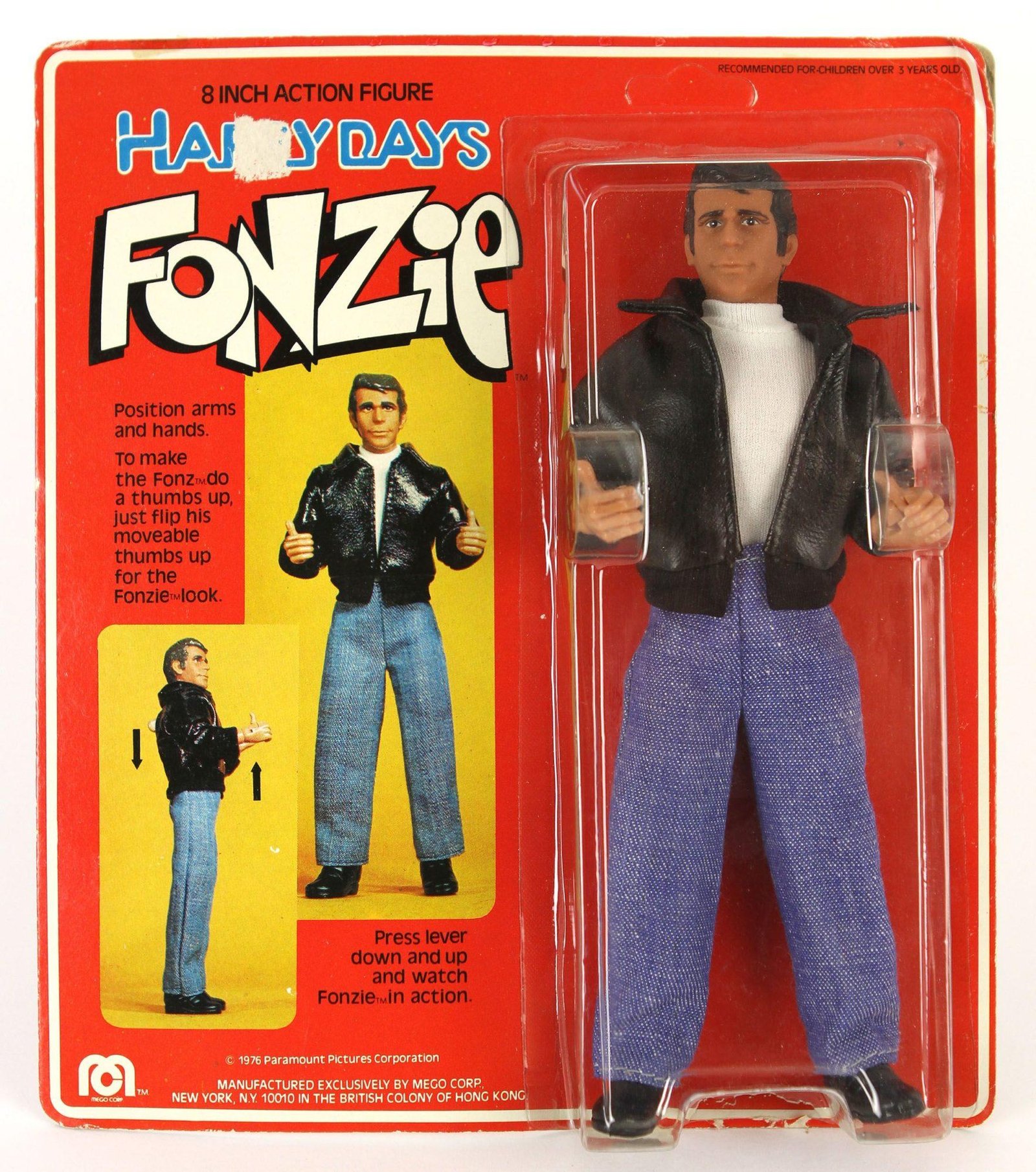 Mego figures haved always been rad. Even the less popular lines included the same great detailing and comprehensive accessories and playsets as the more popular ones. The Mego Happy Days line is one of the better television toy collections. Although there are some likeness problems, particularly with the dour Richie Cunningham, the collection is far better than Mattell’s Welcome Back Kotter Series, for example, if only because of the superior Mego poseability and 8-inch scale. The Fonzie doll, with his jointed thumbs and “thumbs up” action through the mechanism in his back is one of Mego’s better efforts and was a popular toy in his time.