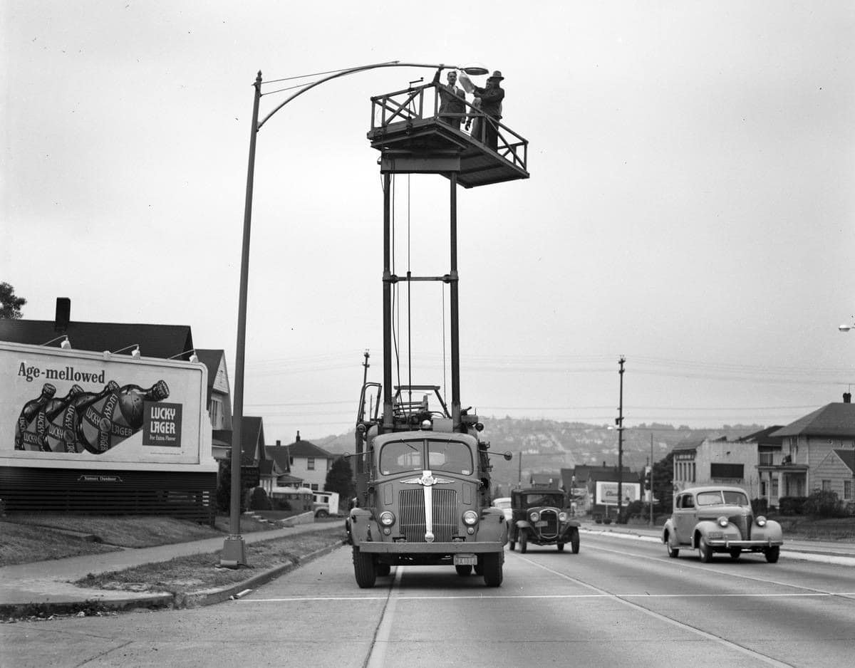 Changing the bulb in a streetlight on Aurora Avenue in Seattle… dig that Lucky Lager billboard. Seeing as this is probably the ’30s or maybe early ’40s, this California beer was definitely in for an uphill battle as there were plenty of local brews and Seattleites were diehard local brew aficionados.