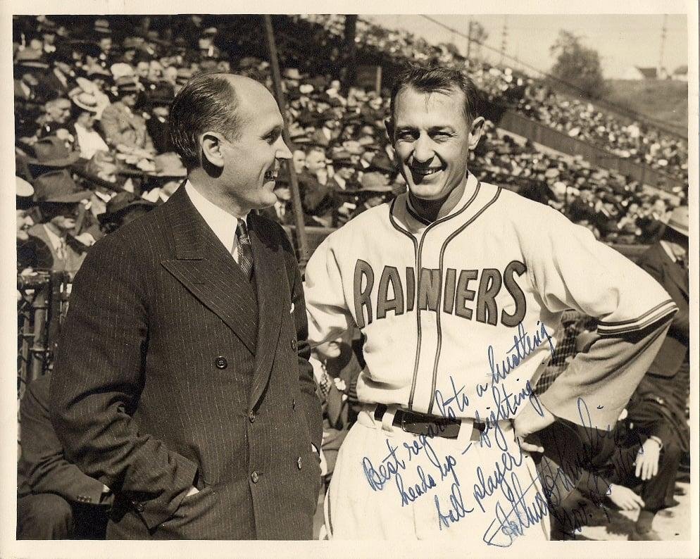 Governor Arthur Langlie and Jo-Jo White of the Seattle Rainiers at Sick’s Stadium in 1941. https://psyne.blog/product/seattle-rainiers-1938-vintage-mens-t-shirt/