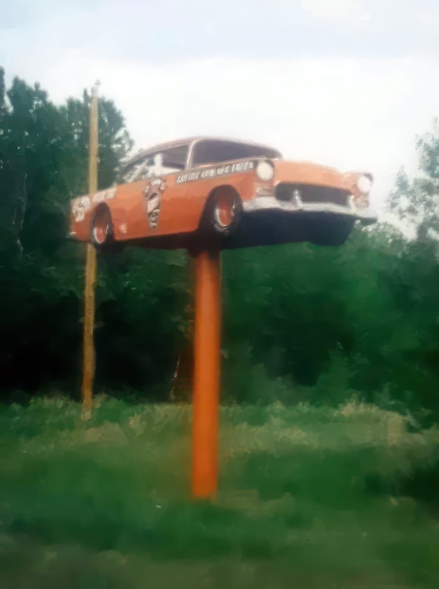 “I built this phantom racer ’55 Chevy pole car to mark the entrance to Riverside Speedway in Nipawin, Saskatchewan, Canada back in the ’90s. The