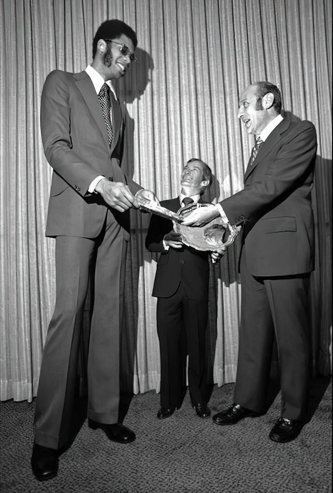 Kareem Abdul Jabbar, the 7-foot-2 star of the Milwaukee Bucks pro basketball team, and jockey Willie Shoemaker, center, who is tall in the saddle, is a study in contrasts as they receive Dewar’s award of merit at luncheon, November 2, 1972, in New York. Both have won more than 2,000 races apiece. But the record for most wins in a single year by a jockey belongs to Eddie Arcaro, who rode 79 winners in 1938 and considered to be the best in their respective sports. The term “the best” is open to interpretation, of course, but it’s generally applied to someone who has consistently proven himself over time and against the competition. H/T>