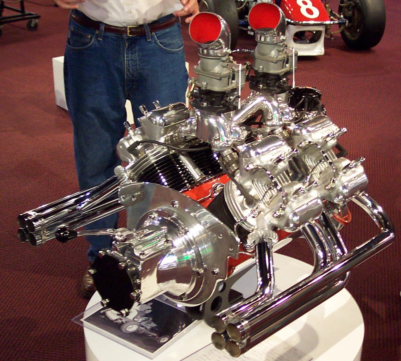 “Made for Sprint Racing, it was built in the ’40s when a crate was something a hot rodder sat on. This is sheer genius-how do you come up with such a combination; Ford V8-60 crankshaft and rods held in a sheet steel block with four Triumph/BSA cylinders and heads on top. Because these are hemi heads this uses three chain driving camshafts, (the chains also drive the oil pump and mag). The standard V8 60 cam runs the intakes, and the other two operate the exhaust. The guys posting on this thought the intake was a heavily cut down Offenhauser unit. Cool the way the headers are grouped like a small block Chevy-which was about 5 or 6 years after this.” – Johnny Pfeiffer H/T