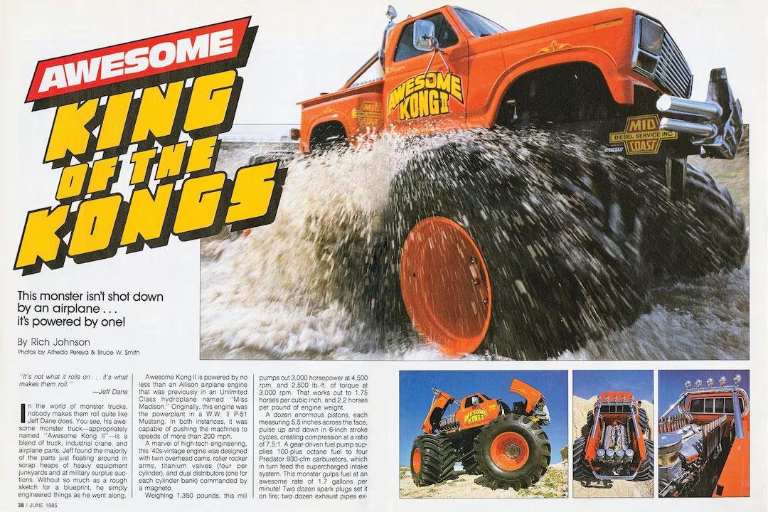 Flip open the hood of a new truck on the lot today, and you might find fewer cylinders in the block than there are fingers on your left paw. We get it; new-age tech gives us better fuel economy, which means more spending change available for the other money-hungry 4x4s in our lives. Jeff Dane evidently had no plans for fuel savings, or modesty of any kind, when constructing his monster truck—”Awesome Kong II” stomped its way onto Four Wheeler’s cover in June of 1985.